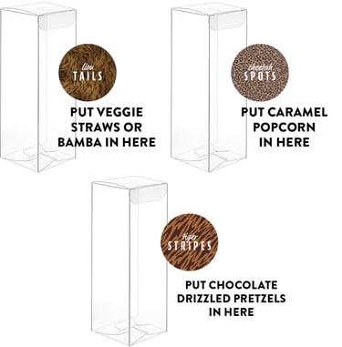 Fill the box with some brown tissue paper. Then add three boxes, with the following items. Add the 1.5" round labels.